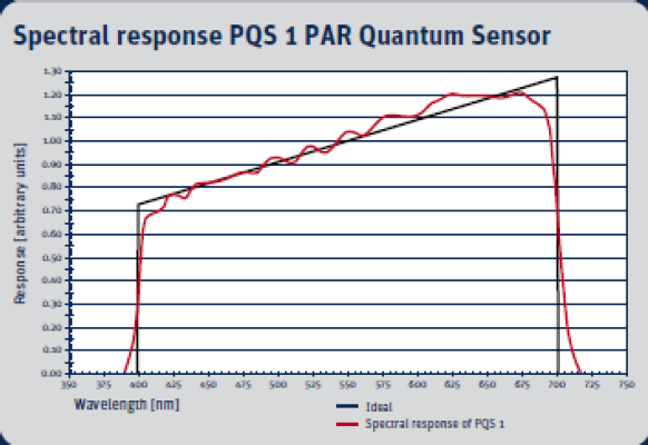 定義的,在這個區域內的光子被等量的吸收。“藍”光子相對較短的波長(高頻率)比‘紅色’長波長有更多的能量。光合有效的量通常表示為光合光量子通量密度(PPFD):摩爾/m2·s。